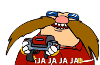 Dr. Eggman from Sonic the Hedgehog laughs heartily, exclaiming '¡JA JA JA JA!' while holding a device, perfect for a villainous chuckle.