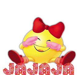 A cheerful yellow emoji with a red bow laughs heartily, exclaiming 'Jajajaja' in this fun animated sticker.