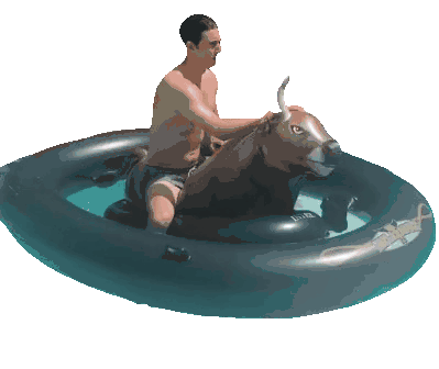 a man is riding a bull in an inflatable raft that says intex