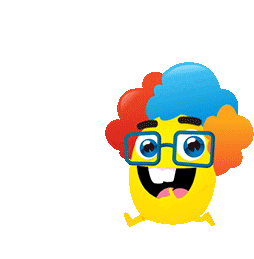 A cheerful yellow mascot with a colorful wig, glasses, and a big smile, holding a red flag and walking, representing Jakmall shopping.
