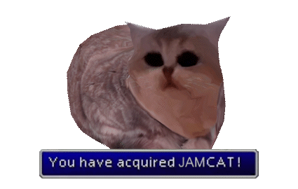 A pixelated, low-poly cat, known as Jamcat, rotates with the text "You have acquired JAMCAT!" displayed below.