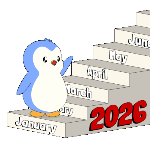 a penguin standing on a set of stairs with the year 2026 on the bottom