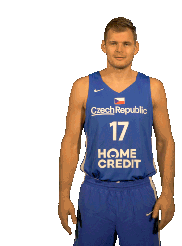 Basketball player Jaromír Bohačík, wearing his Czech Republic jersey, smiles and gives a positive thumbs up.