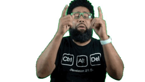Comedian Jason Earls, wearing a 'Ctrl Alt Del' shirt, throws his hands up as the word 'BUT' appears, expressing exasperation.