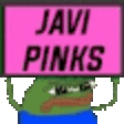 Javi Pinks Peppopinks pixel art frog blinks while holding a pink sign that says 'Javi Pinks'.