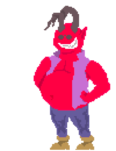 A jazzy red Tiefling character from D&D, wearing sunglasses and a vest, snaps its fingers and vanishes in a puff of pink smoke.