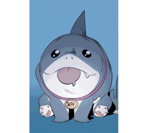 Jeff The Land Shark, a cute cartoon shark with a pink collar and name tag, sits and looks forward in this animated sticker.