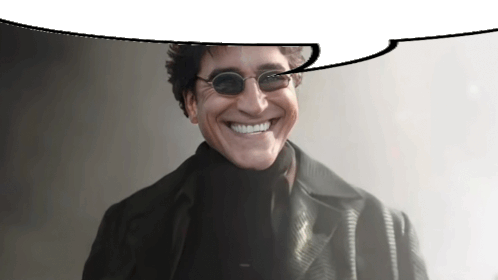 a man wearing sunglasses and a black jacket smiles with a speech bubble above him