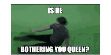 Jerma985 spins on a green background with the text 'Is he bothering you, queens?' in this pixelated meme.