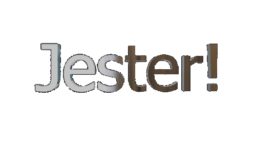 A dynamic 3D animation of the word 'Jester!' rotating and shifting perspective, featuring a metallic texture.