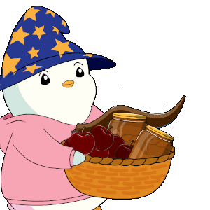 A pudgy penguin wizard, wearing a star-spangled hat and pink hoodie, holds a basket of apples and jars, celebrating a Jewish holiday.