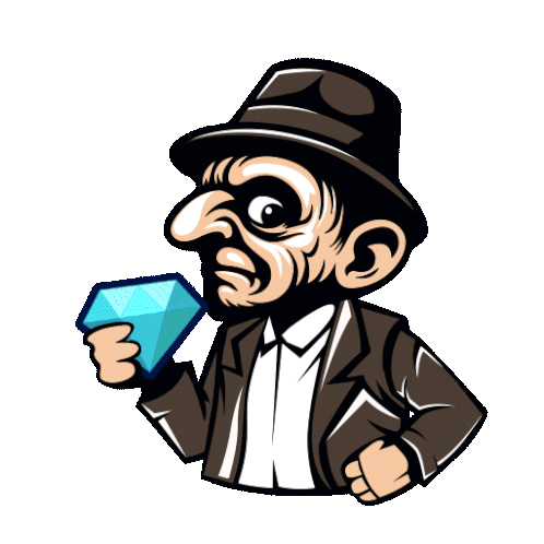 Cartoon character Jewwifhat, wearing a fedora and suit, intensely holds a sparkling blue diamond to his mouth, symbolizing 'diamond hands'.