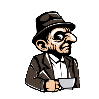 A caricatured man in a hat and suit sips coffee, with 'GM' for good morning behind him. Features Jewwifhat.