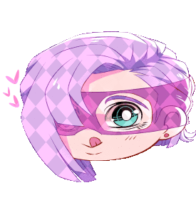 An adorable animated chibi sticker of Melone from Jjba Jojo's Bizarre Adventure, featuring his signature purple hair and mask, with hearts floating around.