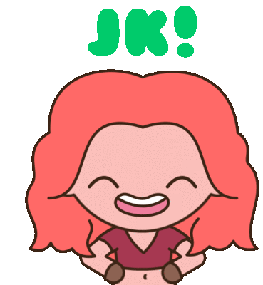 A cheerful cartoon girl, reminiscent of Karen Gillan's Jumanji character, smiles as 'JK!' appears above her.