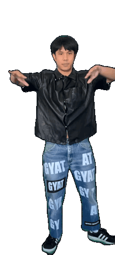 Yeezaa performs a dance, wearing a black shirt and blue jeans with 'GYAT' printed, in a 'Job Michigan Canyon' style.