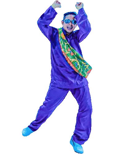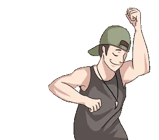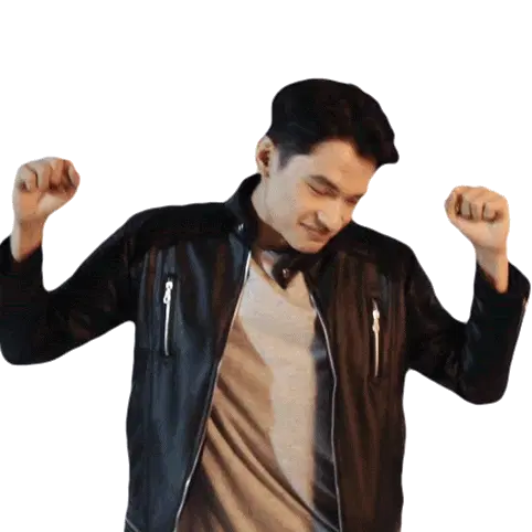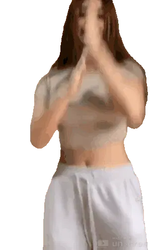 A young woman performs a 'joget goyang' dance, smiling and swaying playfully with a finger gesture.