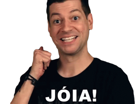 Excited man, possibly Galo Frito, gives a thumbs up and exclaims 'Jóia!', expressing approval and enthusiasm.