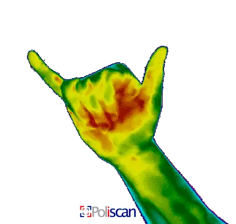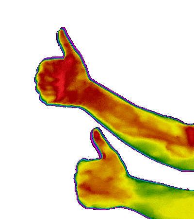 A thermal camera view of hands giving a "thumbs up" or "joinha" gesture, showing heat patterns.