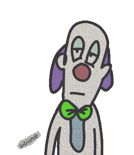 A sad, clown-like dog character with a green bow tie reacts with a poker face, implying a 'joke drums' sound effect.