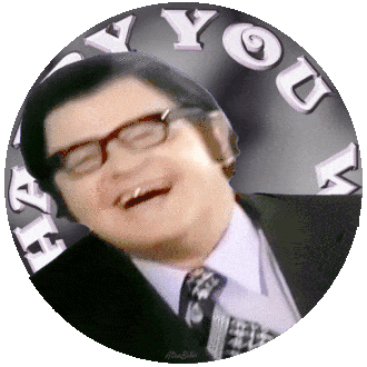 Benny Hill laughs joyfully with the encouraging message 'YOU WILL BE HAPPY' rotating in the background, perfect for sharing a laugh.