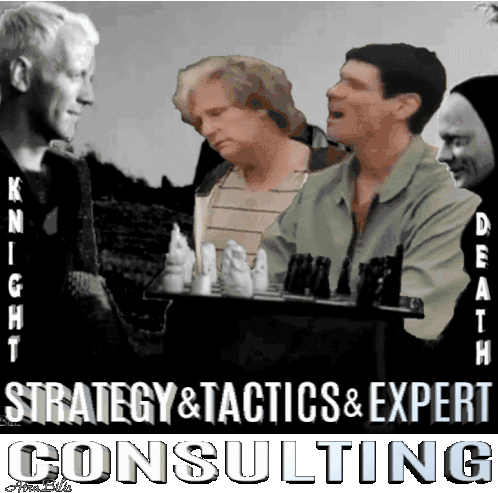 Jim Carrey and friends parody The Seventh Seal, playing chess with Death and a Knight for strategy and expert consulting.
