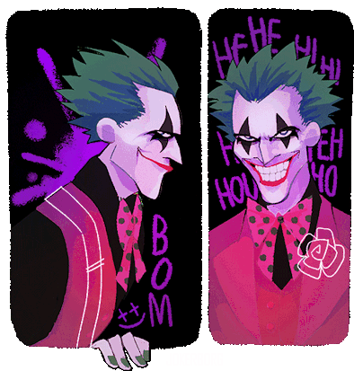 Joker Batman in stylized purple and pink art, featuring two poses with a mischievous grin and 'HEHEHE' text.