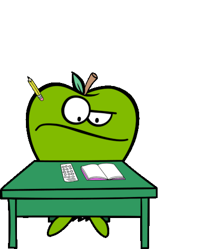 A green apple character, possibly Jolly Rancher, reacts with a surprised 'Wait, What?' expression while studying.