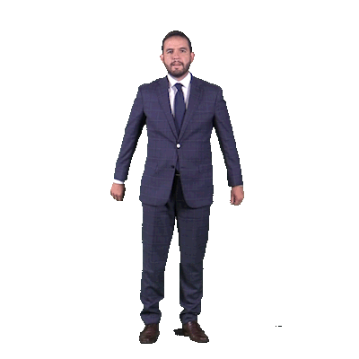 Jorge Mercader celebrates excitedly in a suit, standing before the FOX DEPORTES logo, conveying enthusiasm and triumph.