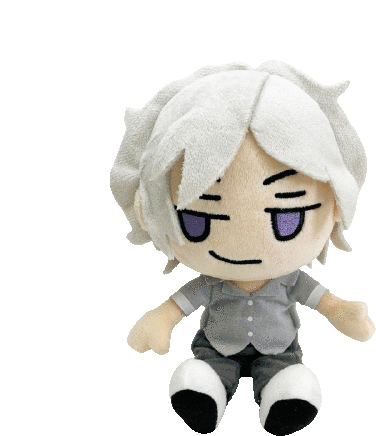 Joshua Yoshiya Kiryu, a cute stuffed toy with white hair and purple eyes, sits on a white surface.