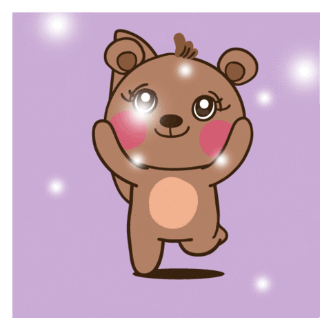 A cute brown bear-like character joyfully dancing or jumping with sparkling effects on a light purple background.