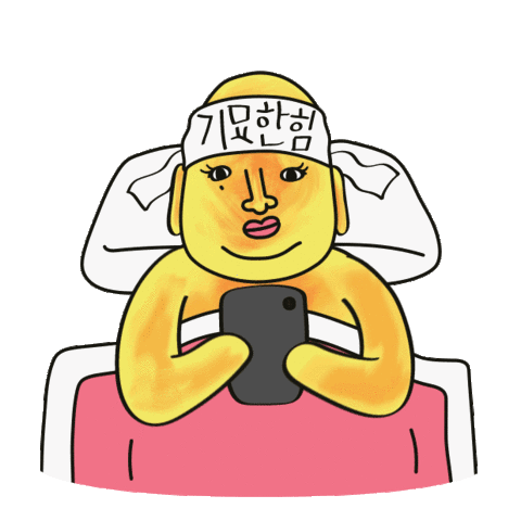 A cartoon character in bed, laughing hysterically while looking at a phone, with 'Strange power' on headband.