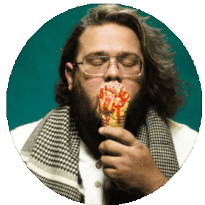 Man with glasses and beard enthusiastically licks a colorful, sprinkled ice cream cone, rotating playfully.