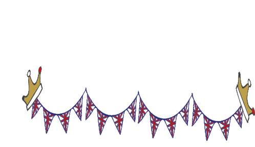 Celebrate the Platinum Jubilee with this sticker featuring Union Jack bunting and golden crowns, honoring Queen Elizabeth.