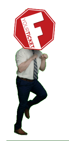 A man with a 'F Your Ticket' stop sign head dances, celebrating a dismissed traffic ticket.
