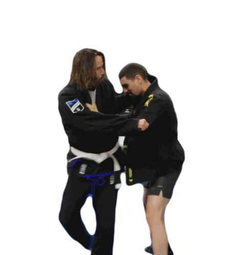 Two men engaged in a judo martial arts combat, demonstrating a tackle and takedown, in the style of Keanu Reeves.