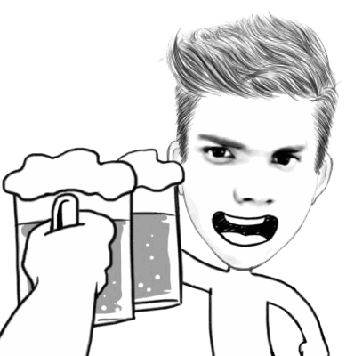 Santosh Dawar's black and white drawing of a man with a large head holding a frothy beer jug, perfect for cheers.
