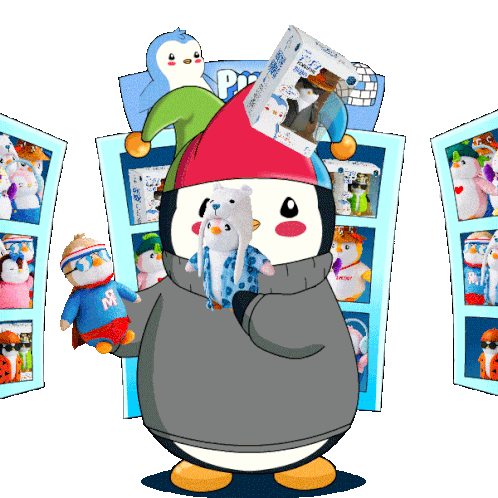 a cartoon of a penguin holding stuffed animals in front of a display of penguins