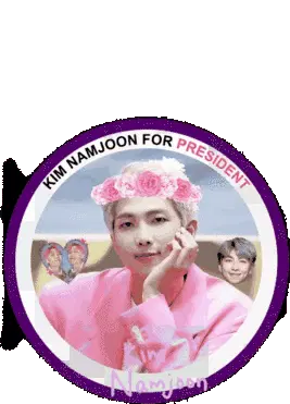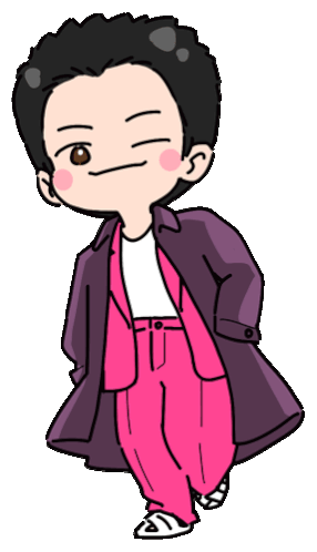 Juheeyu's BTS RM cartoon winks, dressed in a vibrant pink suit and a stylish purple coat.