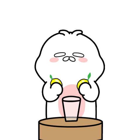 A cute cartoon character drinks yellow juice from a glass, then looks surprised when it's gone, leaving lemon slices.