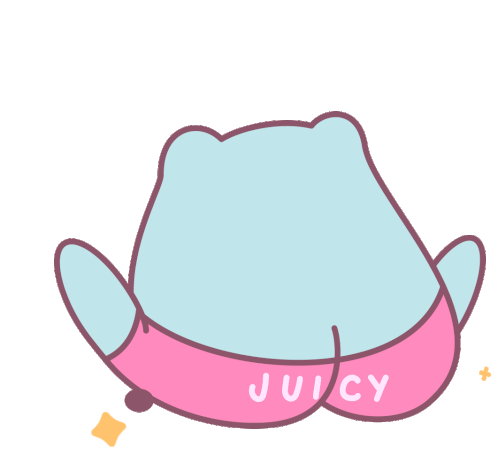A cute blue frog-like character wearing pink shorts with 'JUICY' written on the back, wiggling its booty.