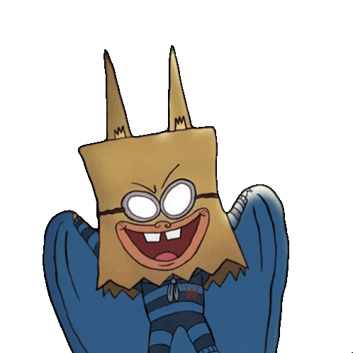 Damian Wayne, from Merry Little Batman, joyfully jumps or leaps, wearing a paper bag over his head and a blue cape.