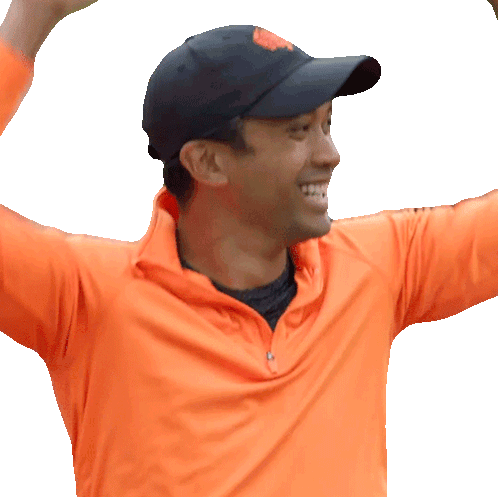 Gilmore Junio jumps with joy, arms raised, celebrating with an elated and overjoyed expression.