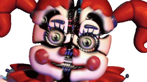 FNAF Circus Baby animatronic sticker featuring a sudden, glitching jumpscare with large green eyes and red cheeks.