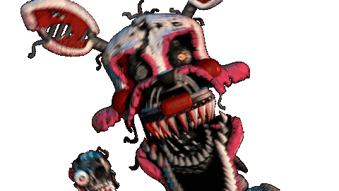 The terrifying Nightmare Mangle from FNaF lunges forward in a distorted, pixelated jumpscare, revealing sharp teeth and damaged parts.
