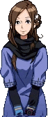 June Akane, a character from Zero Escape, depicted in pixel art, smiling while wearing a blue dress and black scarf.