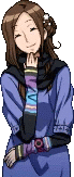 June Akane, a pixel art character from Zero Escape, smiles happily with her hand to her chin, wearing a purple top and black scarf.