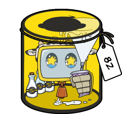 Animated Jungletv NFT sticker featuring a crying cow-like character with a TV head inside a yellow jar, producing milk.