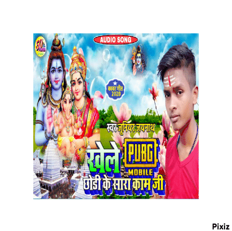 A rotating 3D cube features singer Junior Jaynath Raj, Hindu deities Shiva, Parvati, Ganesha, and text for a Bhojpuri devotional song about PUBG.