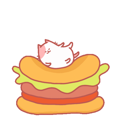 A cute white cat joyfully floats above a delicious, layered hamburger, representing classic junk food and fast food.